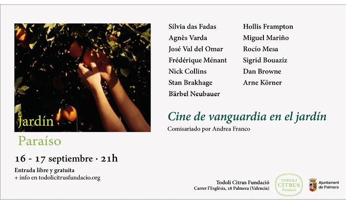Una muestra concebida para (e inspirada por) el jardín de cítricos de Todolí Citrus Fundació, con el objeto de ofrecer una experiencia artística y cultural en la que el cine dialogue con este espacio singular. Cada sesión presentó una selección de obras breves de autores tanto clásicos como emergentes; piezas sonoras o silentes; abstractas o figurativas; filmadas en celuloide o en digital.